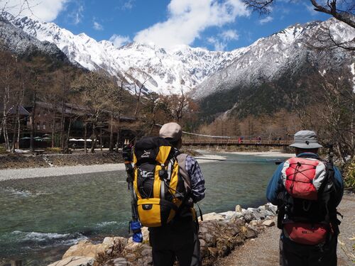 令和元年5月7日 残雪の涸沢に行きましょうとお誘いを受け5/7に、船橋駅で待合せしてあずさ3号に乗車。 特急あずさは今年から全車指定になり車両も新車両になりました。あたらしい車両を楽しみながら松本に到着 梓川と河童橋 ローカル線に乗り換えて新島々…